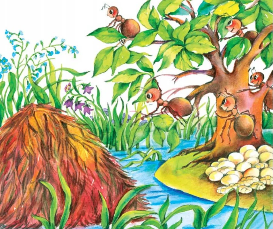 Құмырсқалар ілімімен танысасыңдар, – деп, тәрбиеші кішкентай құмырсқаларды қараңғы дәлізбен ертіп жүрді. Балабақшада оларды күтушілері қуанышпен қарсы алды. Тәтті, дәмді ас беріп, тамақтандырды. Тамақтанған бала құмырсқалар: «Қандай дәмді! Тағыда бар ма?» деді жамырап. Сонда тәрбиешілердің біреуі: – Әрине, тек енді әркім өз қорегін өзі жинайды. Тез қозғалып, соңымнан еріңдер! – деп басқа бөлмеге бет алады. Кішкентай құмырсқалар соңынан ілесіп отырды. Ол жерде кішкене қоңыздар мен бөжектер толып жүр екен.